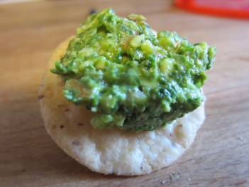 Put all the ingredients in a food processor and process in short bursts until it’s smooth.  Add more oil as needed for consistency.  Taste and adjust the seasoning.  For longevity, Clotilde Dusoulier, the author of the blog, advices to either freeze it or pack it in an airtight container and that if you add a thin layer of oil to the top it will stay fresh longer.  I appreciated the advice but I doubt it will be necessary – this pesto will be gone within a day.