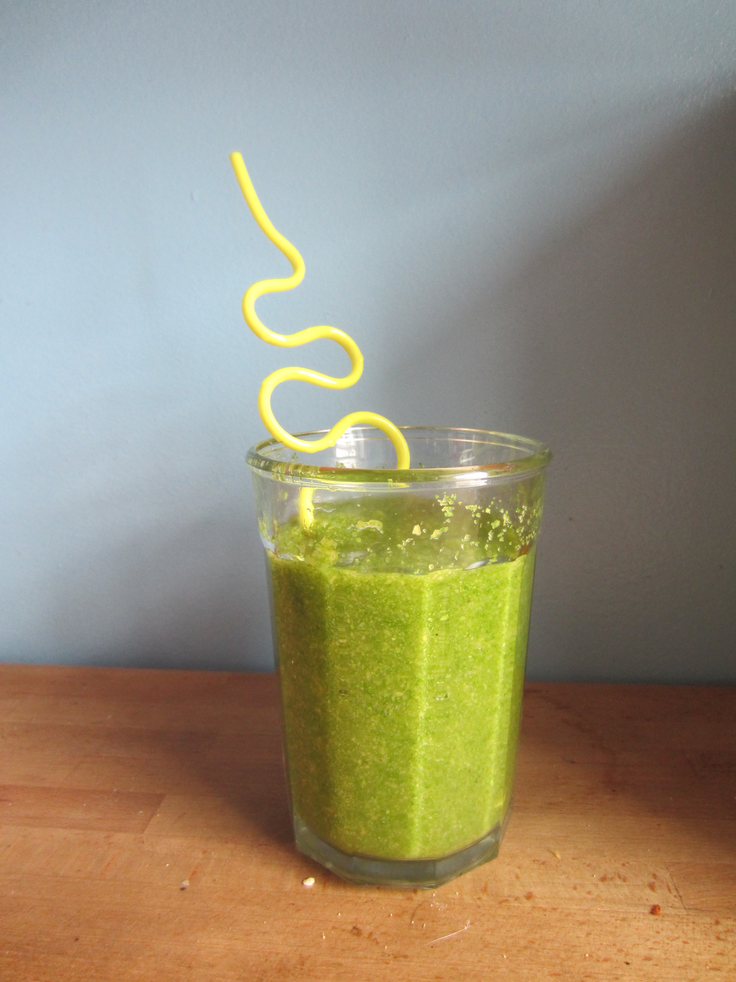 So, I am in a CSA.  Every Wednesday, me and/or my boyfriend Pete trudge over to Flatbush Avenue (it really isn’t that bad, I am just being dramatic) to retrieve our bags of goodies.  Generally it’s all we can do to eat it all before the next bounty arrives, what with our work schedules and random social events coming up here and there.  We usually make it through most the stuff; although, to be fair, we have about 3 pounds of radishes languishing on the bottom shelf of our refrigerator.  Well, last Wednesday afternoon, pre-CSA pick-up, Pete went out of town and left me the sole care-eater of all the veggies.  For the first few days it went okay, but then the weekend and a number of social obligations came up and now, all of a sudden, it’s Wednesday again and I have a fridge full of perishables! Corn!  Eggplant!  Cucumbers!  And, perhaps the most troublesome — and the biggest space hog — lettuce!  What’s a girl to do with all that greenery?  Why, drink it of course!